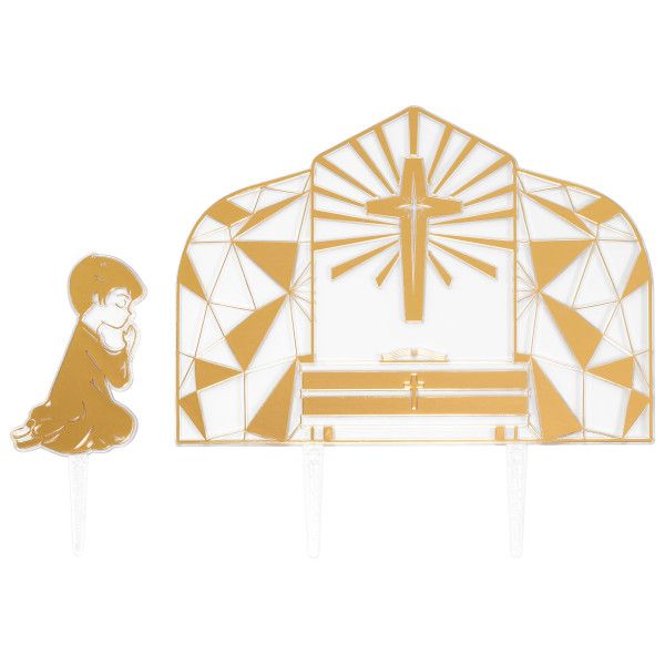 A sweet communion cake is easy to make with this Communion Boyl layon. Gold and clear plastic brings an elegant feel to the alter backdrop and praying girl. 2-Piece set.