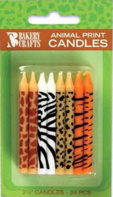 Make your next cake take a walk on the wild side with these fun animal print candles. An assortment of pink, purple, teal and white animal printed candles perfectly top off any cake or cupcakes. 12 packages of candles per box.