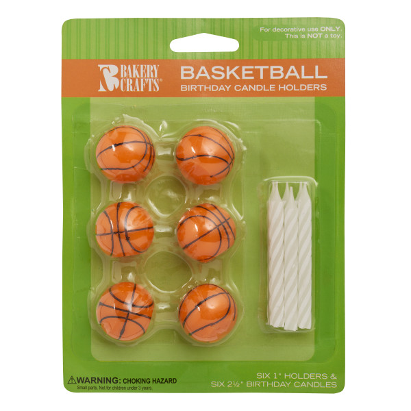 Score major points with these candles. Assortment includes 6 classic basketball candle holders and 6 white spiral candles. 6 packages of candles per box.