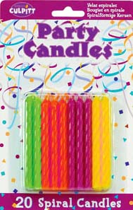 Bright, vibrant spiral candles in solid pink, yellow, orange and lime green. Ideal for cakes and cupcakes. Includes four yellow, six pink, six orange and four lime green candles. Ideal for cakes and cupcakes. 12 packages of candles per box.