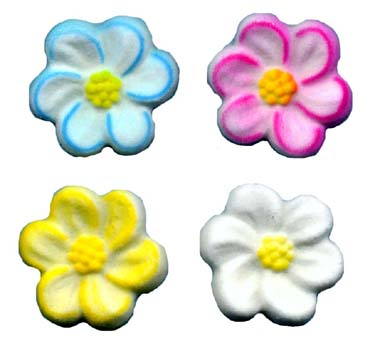 Brilliant Spring blossoms enhance a variety of treats! These decorations add a dose of tasty color to your cake creation! Assortment includes flowers in yellow, blue, pink, and white.