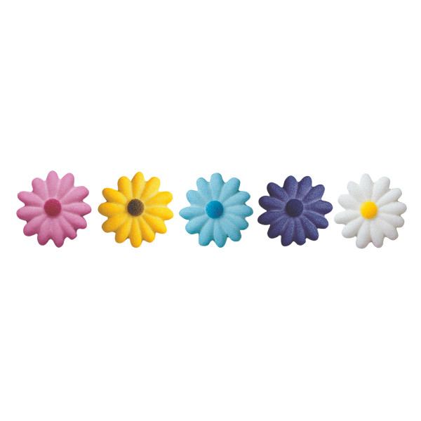 Add a vibrant, floral touch to any dessert with energetic daisy decorations. Assortment in pink, yellow, light blue, indigo and white.