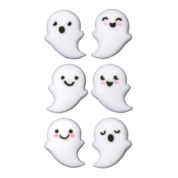 A ghost for every emotion! These ghoulish guests take the edge off Halloween, and provide an inviting theme! Made of finely granulated sugar molded into shapes and painted with edible food color.