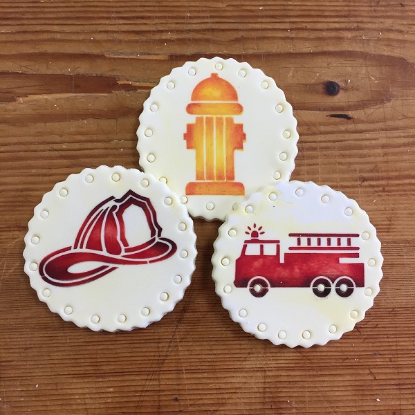 Celebrate firefighters with a fireman’s hat, fire hydrant, and fire truck. The patterns fit within a 2.7 inch circle and are approximately 2.5″ x 2.5″. They look good on 3 inch cookies or larger. Laser cut from durable, 10 mil food grade plastic for repeated use.