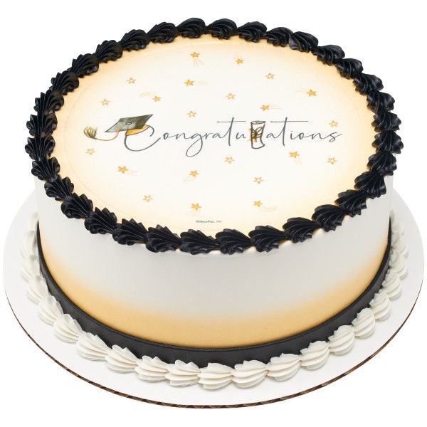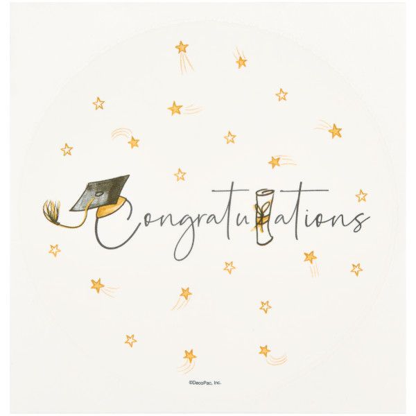 Celebrate new grads with a classic cake great for any graduation party. This colorful printed design is made primarily from starch, sugar, and edible food colors. Can apply to iced cakes, cookies, and ice cream cakes. Neutral taste. Melds into icing. Doesn’t tear when cut.