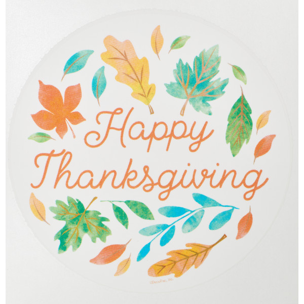 Adorn your desserts in a fall foliage-filled Thanksgiving Edible Image®! Colorful printed designs made primarily from starch, sugar, and edible food colors. Can apply to iced cakes, cookies, cupcakes and ice cream cakes. Neutral taste. Melds into icing. Doesn’t tear when cut.