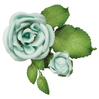 Decorate a cake with these light blue roses, featuring bold green leaves. Ready to place, pre-colored gum paste flowers. Gum paste is safe for food contact and not intended to be eaten. Product is fragile; some breakage may occur. Product has been priced accordingly.