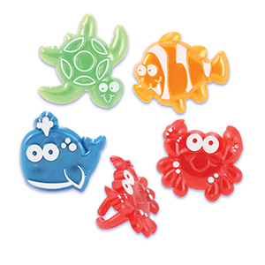 Bring these ocean friends to your dessert display. These assorted rings feature turtles, whales, fish, and crabs. Great for cupcakes, donuts, or even finish off the look of a cake. Made with food-safe plastic.