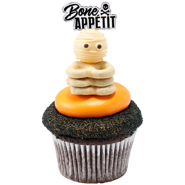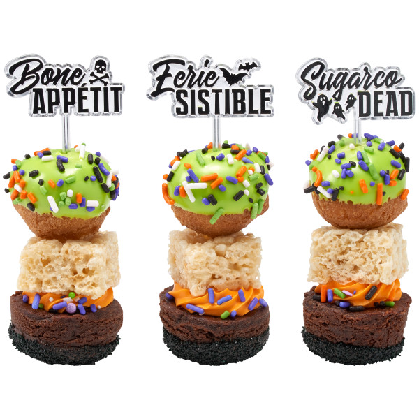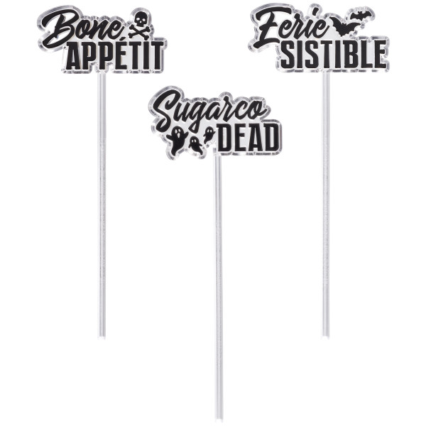 Add some Eek! to your cake with a layon assortment that stands tall atop your desserts! Assortment includes Trick or Treat, Eek and Boo designs in various finishes.