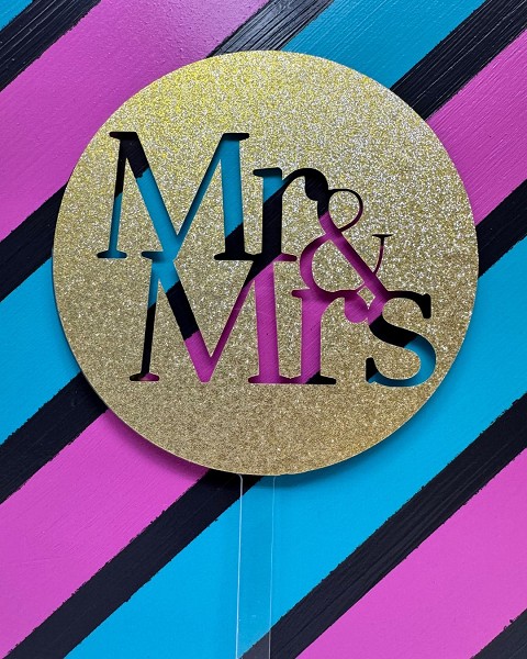 Celebrate that special day with our Mr & Mrs wedding topper! A round acryllic design with a gold glitter overlay.