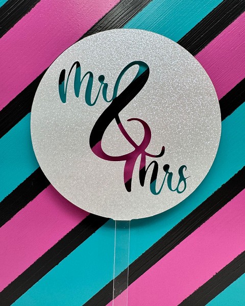 Celebrate that special day with our Mr & Mrs wedding topper! A round acryllic design with a white glitter overlay.