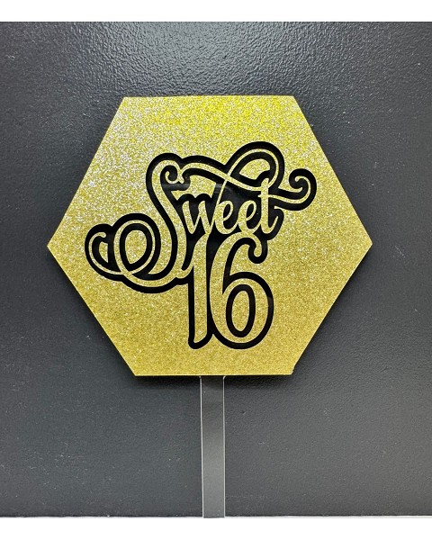 Celebrate that special Sweet 16 Birthday with our Hexagon Acrylic Cake Toppers, with a gold glitter overlay.