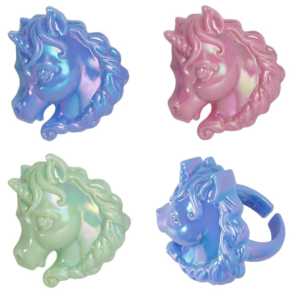 These unicorn rings are colorful and iridescent. Add them to your dessert displays and little girls will surely gravitate towards them. Great for cupcakes, donuts, or even finish off the look of a cake. Made with food-safe plastic.