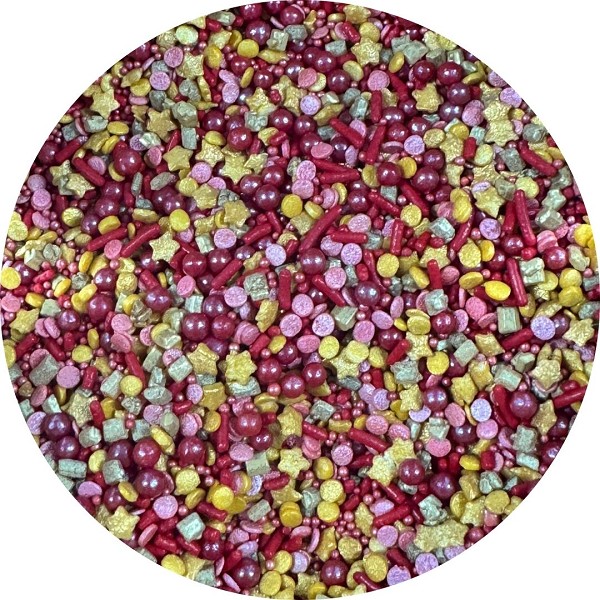 Mix includes- pearls, jimmies, small dots, stars and more, in a mix of reds and golds!