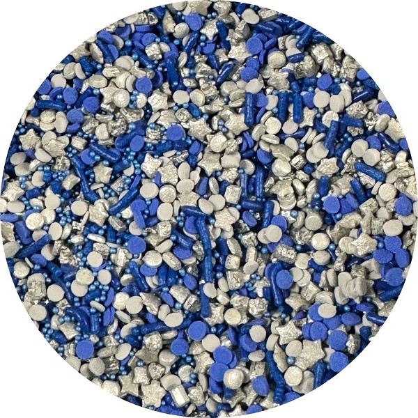 Mix includes- pearls, jimmies, small dots, stars and more, in a mix of blues and silvers!