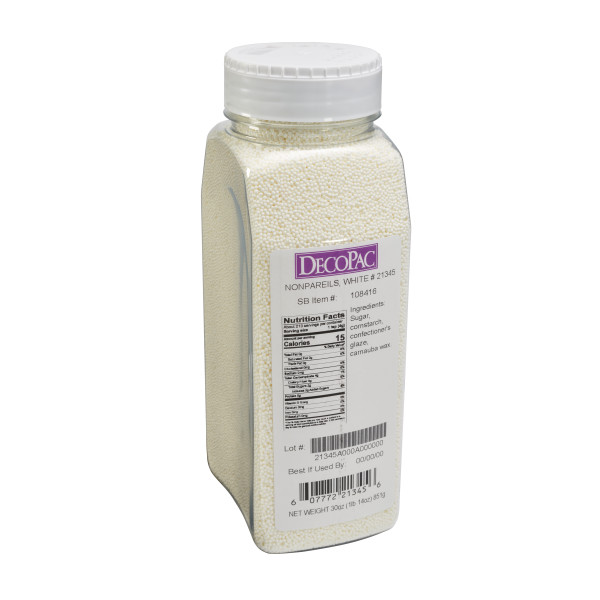 Top off sweet treats with White Nonpareils. 30 oz. handheld container.